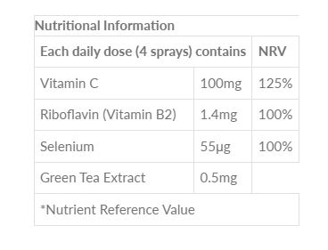Delivers 100mg of bioavailable vitamin C, naturally sourced from acerola cherries with added selenium, riboflaving and green tea extract delivered in a fast, effective oral spray to help maintain vitamin C levels throughout the day.