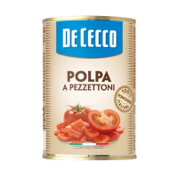 De Cecco polpa a pezzettoni is a chunky-style tomato pulp made from ripe Italian tomatoes, skinned and cut into large pieces then immersed in dense tomato juice. Refrigerate after opening and con..